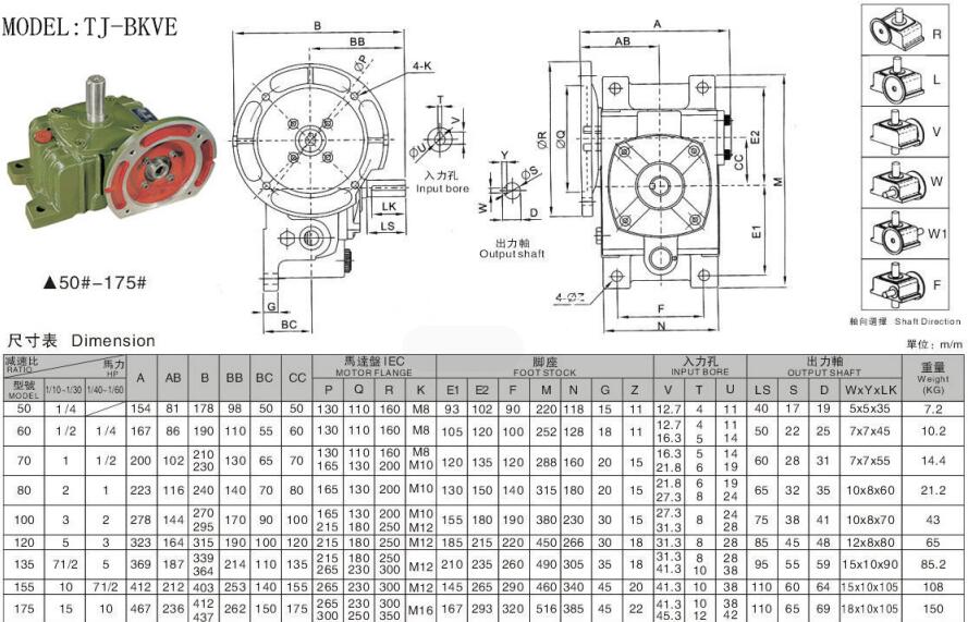 5、輸出、輸入軸位置方向有輸入軸在下及在上;輸出軸向上及向下;輸入軸向上及向下。